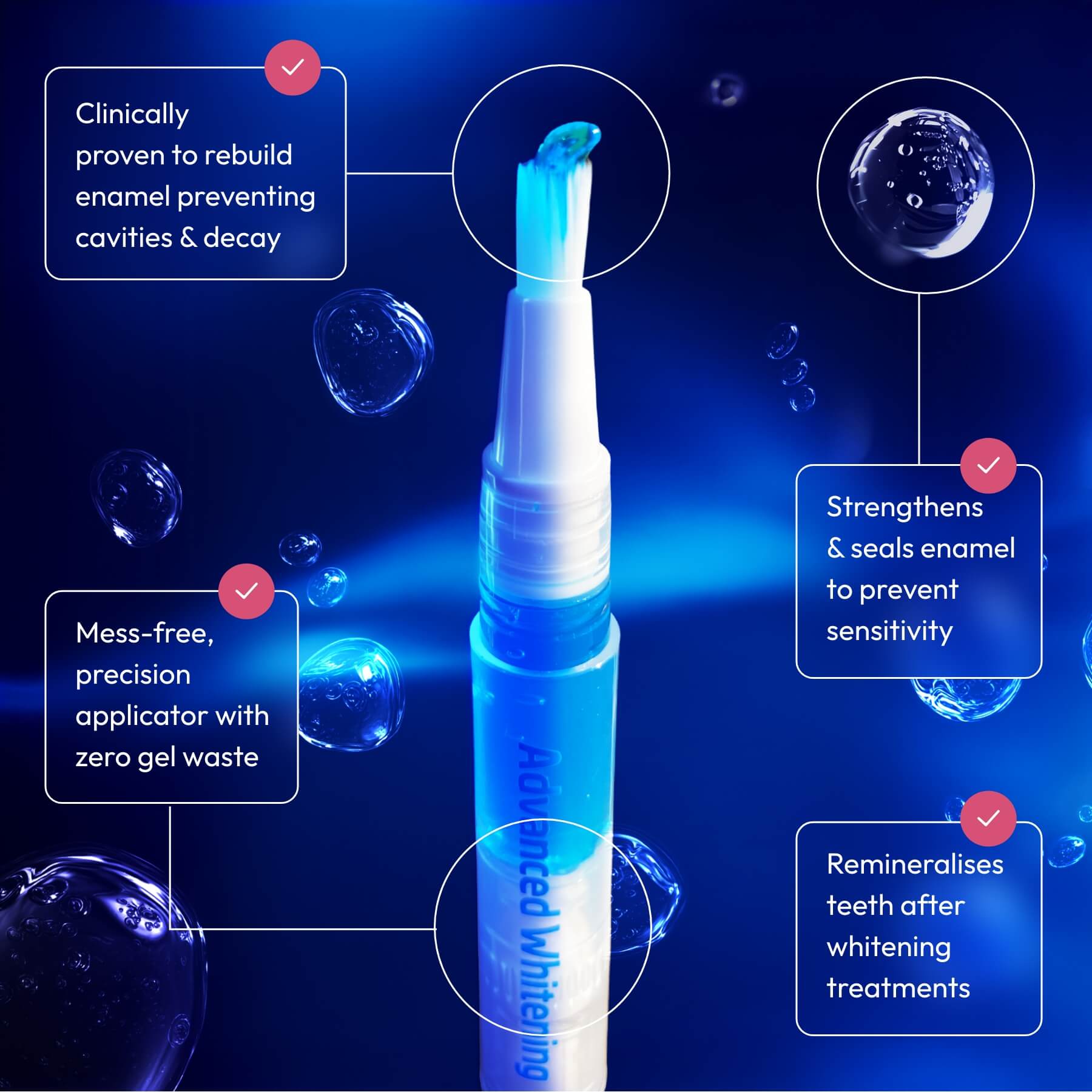 The Advanced Whitening Enamel Booster increases the micro-hardness of tooth enamel and remineralises teeth through a strong formula of fluoride and calcium phosphate. Plus the Enamel Booster also helps prevent and soothe tooth sensitivity by strengthening and sealing tooth enamel.
